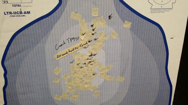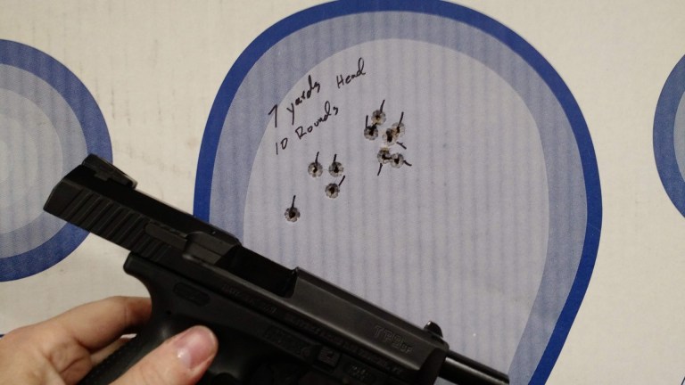 As stated before, improved sights over the stock sights would improve sight acquisition. After a few rounds and adjusting to the TP9SF, I found the recoil to be a non-existent factor. Once again you can see some rounds I pulled, I will not cherry pick the best groups.