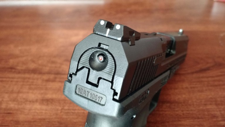The stock rear TP9SF sights are very distracting for fast pick-up and shooting. There is just a little too much going on with the rear sight. I took a sharpie and blacked out the rear sight post line. This improved overall sight acquisition during shooting, to a traditional three (3) dot sight configuration feel.