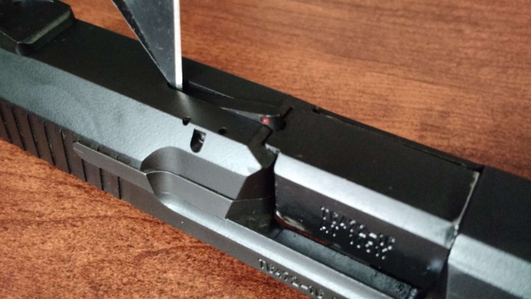 The Canik slide is machine cut/milled from a solid block of high carbon steel. The slide has a smooth even black Cerakote over a phosphate finish. The slide is rounded and beveled on the edges, across the top, front and back.