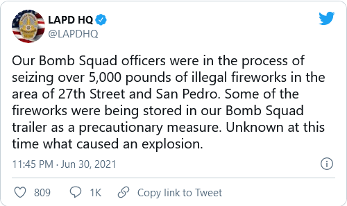 The enormous explosion, which caught the attention of the national press, was triggered by the more than 5K pounds of illegal fireworks confiscated from a home in South LA. One individual was arrested in the raid that led to the fireworks.