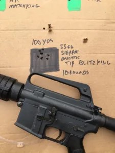 I borrowed my friends Colt SP-1 AR15 carbine to find out. The gun has everything an early AR15 could be given to it by Colt. The A1 sights, the A1 profile barrel and the 1/12 twist chrome lined Mil-spec bore. I set the gun up on rest with bags front and read and got it as locked down as I could get it and started shooting with match quality hand loads.