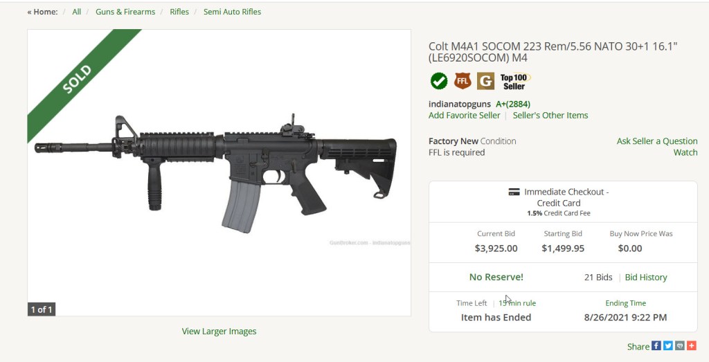 The 2018 Model LE6920 SOCOM was last produced around the end of 2018. The only 2018 Model LE6920 SOCOMs that have been available since then have been on the secondary market. I have seen a couple of examples push $5000 on Gun Broker. The highest sales price that I have seen for a recent auction was a new in box (NIB) example that sold for $3900 on 26 August 2021. The market average on these has been around $2300 to $2500.