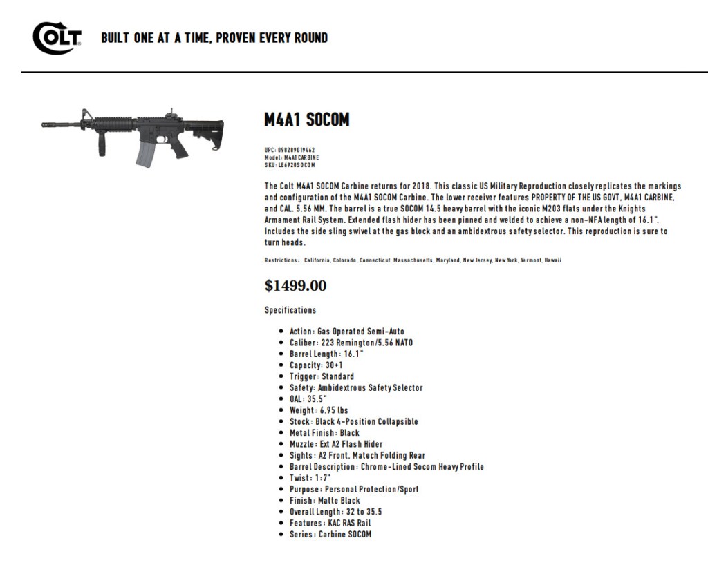 If you have been wanting a Colt 2018 Model LE6920 SOCOM but didn’t want to pay $2500 to $3000 on the secondary market, your chance is coming. Below is a screen image of the product page on the Colt website. https://www.colt.com/detail-page/colt-ar-15-socom-carbine-223556-161-301-knights-rail-forend