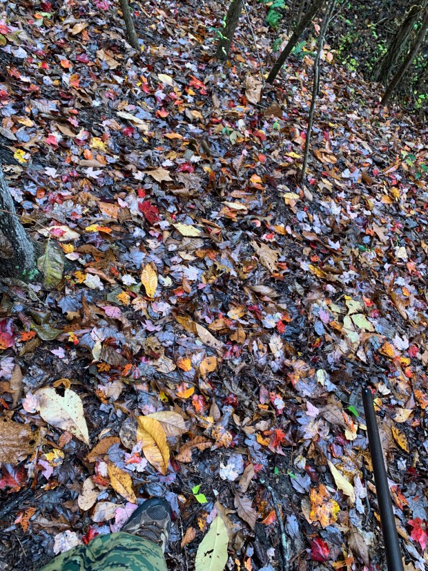 The leaves are coming off quick now. Yesterday was rainy and very cool on top of the mountains. Climbing those mountains covered in wet, slick leaves is not an easy thing to do.