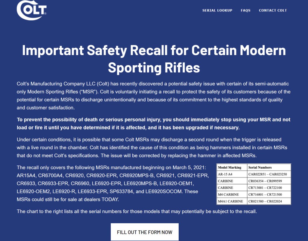 Colt published a safety recall today. The recall has occurred because Colt identified that some hammers that were out of Colt specification were used in some rifle/carbine assembly since roughly March of 2021.