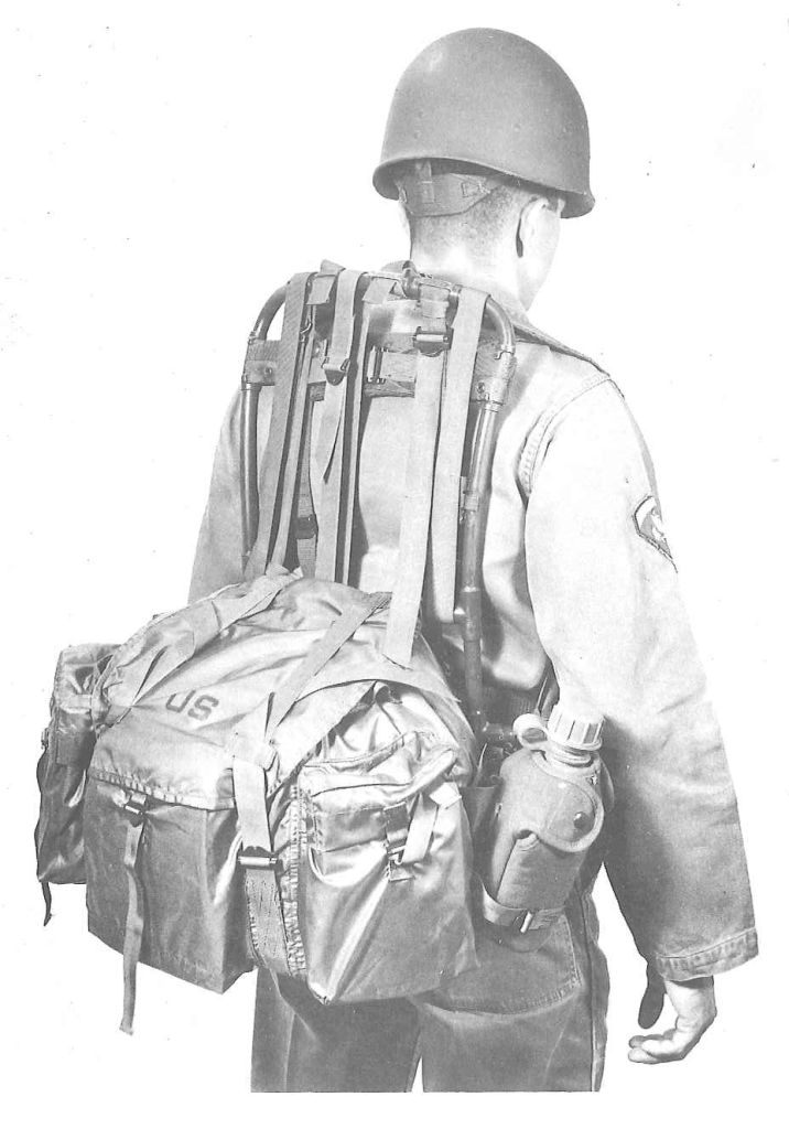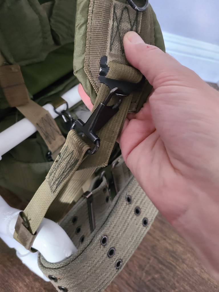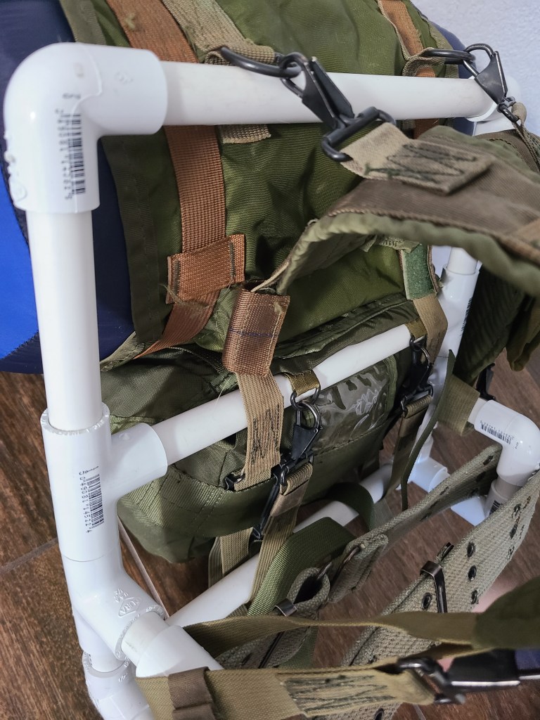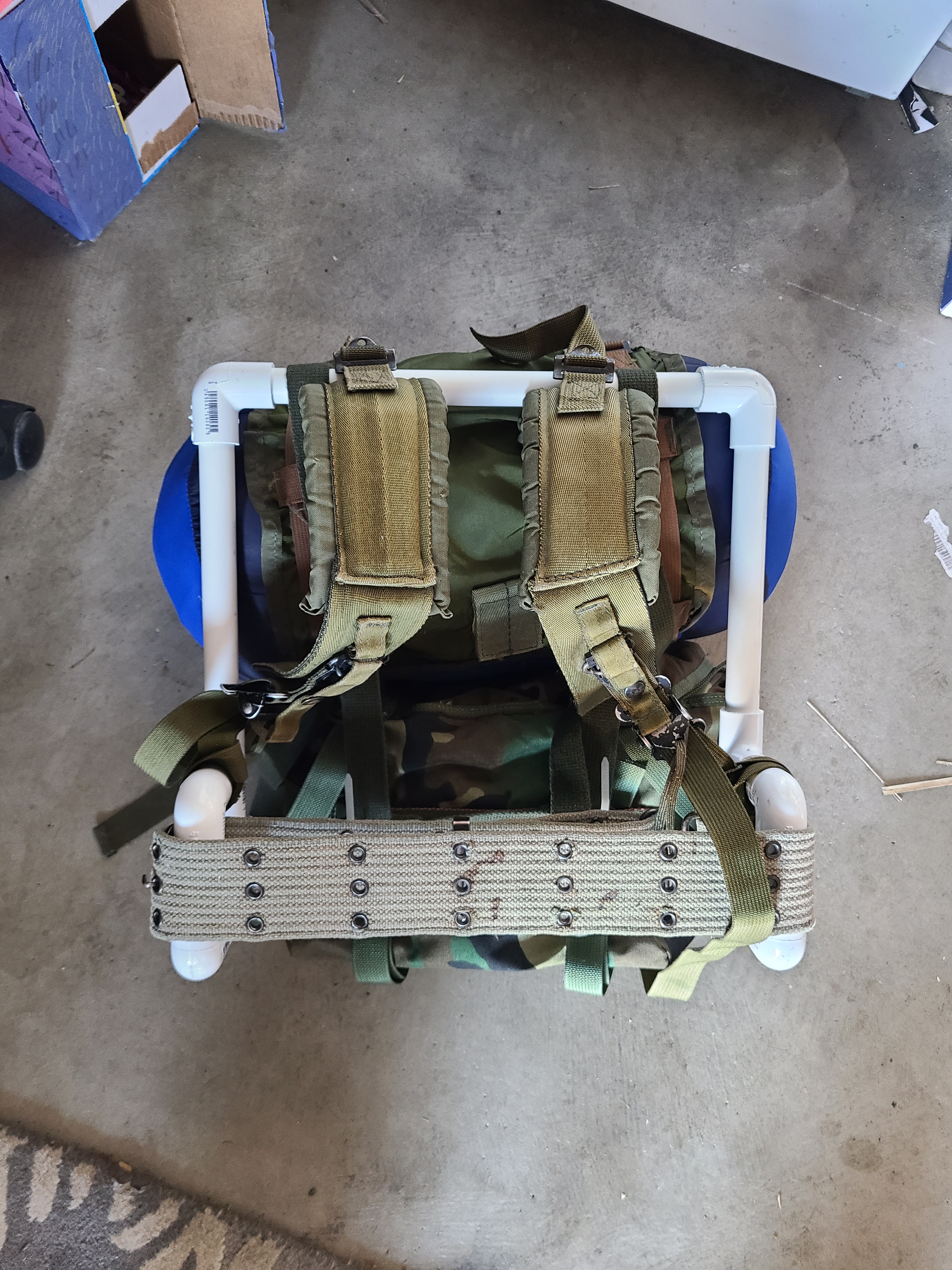So I tried the same idea but with the goal of using less items and not having to paracord or zip tie anything. Plus with an eye to the look of the original lightweight ruck. Settled on just four pieces plus an addition of a center bar in the frame. M1967 suspenders and sleeping roll carrier an ALICE era butt/field training pack and web belt.