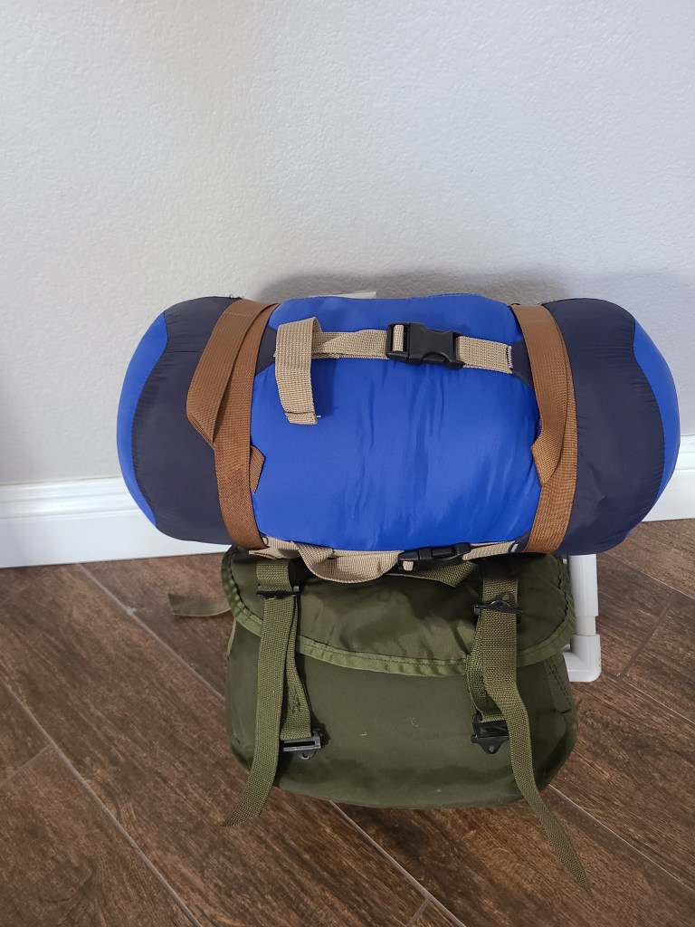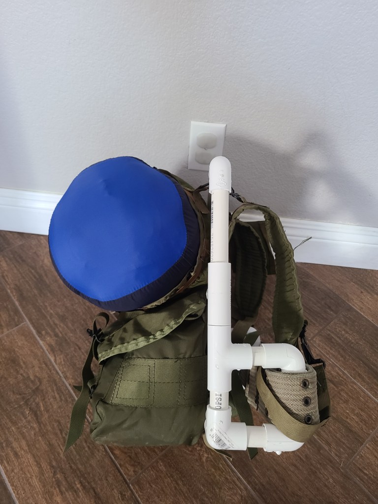 Why a Lightweight Rucksack and not a regular backpack? Well a regular backpack can’t carry a sleeping bag. I threw a prototype together to test the concept. I used an M1956 pack adapter and ALICE suspenders and some various butt/training packs and a M1967 sleeping roll carrier. And it worked pretty well. But it was a bit of a strap master and required the pack adapter be zip tied to the bottom bar.