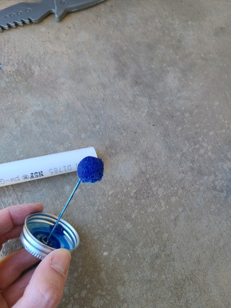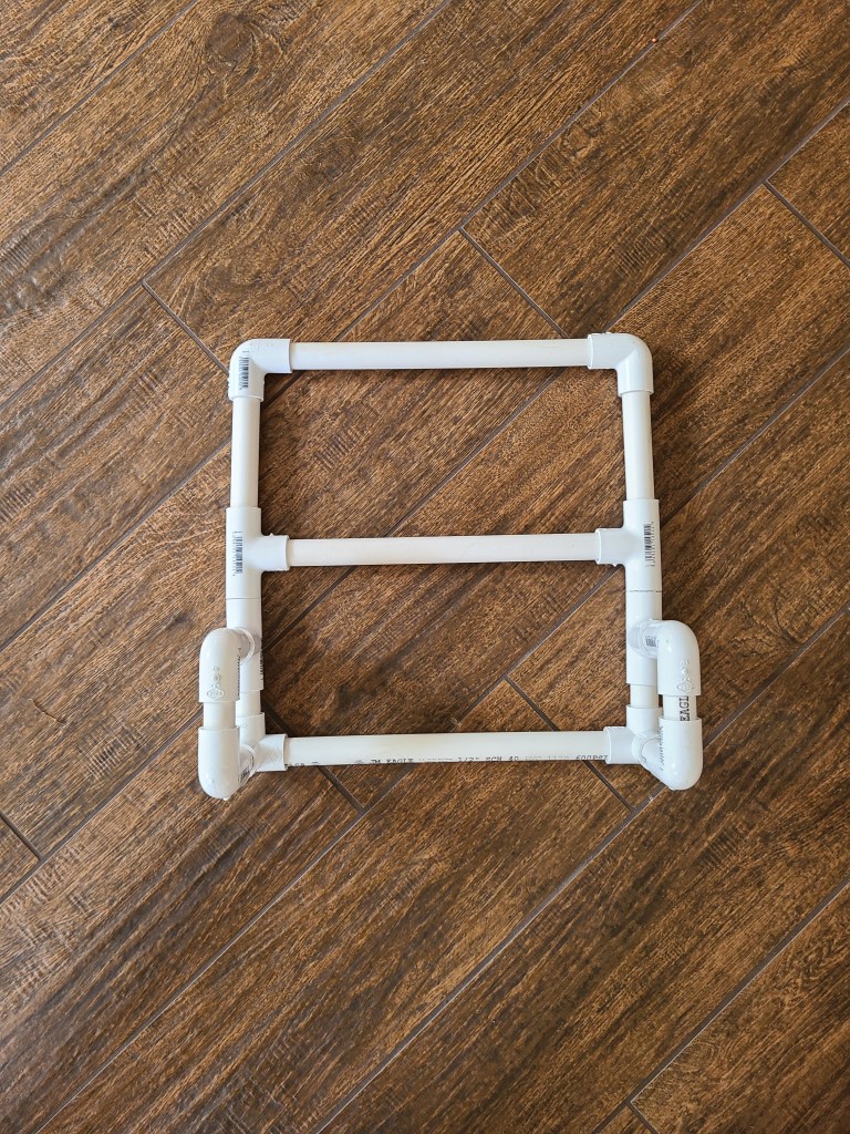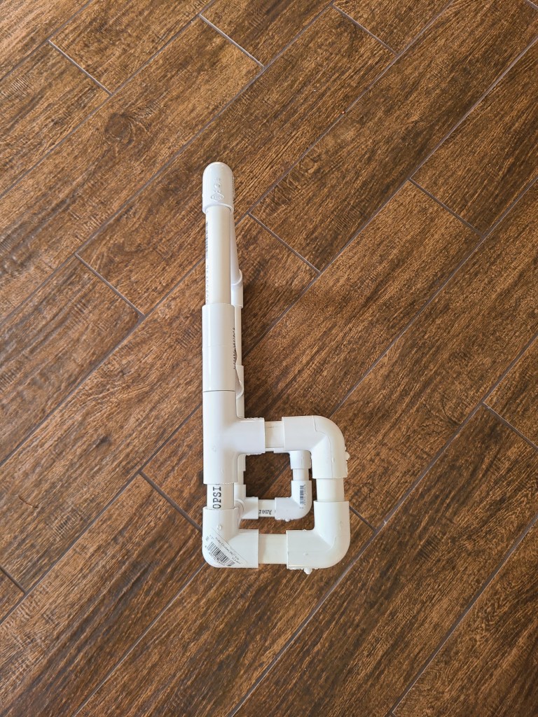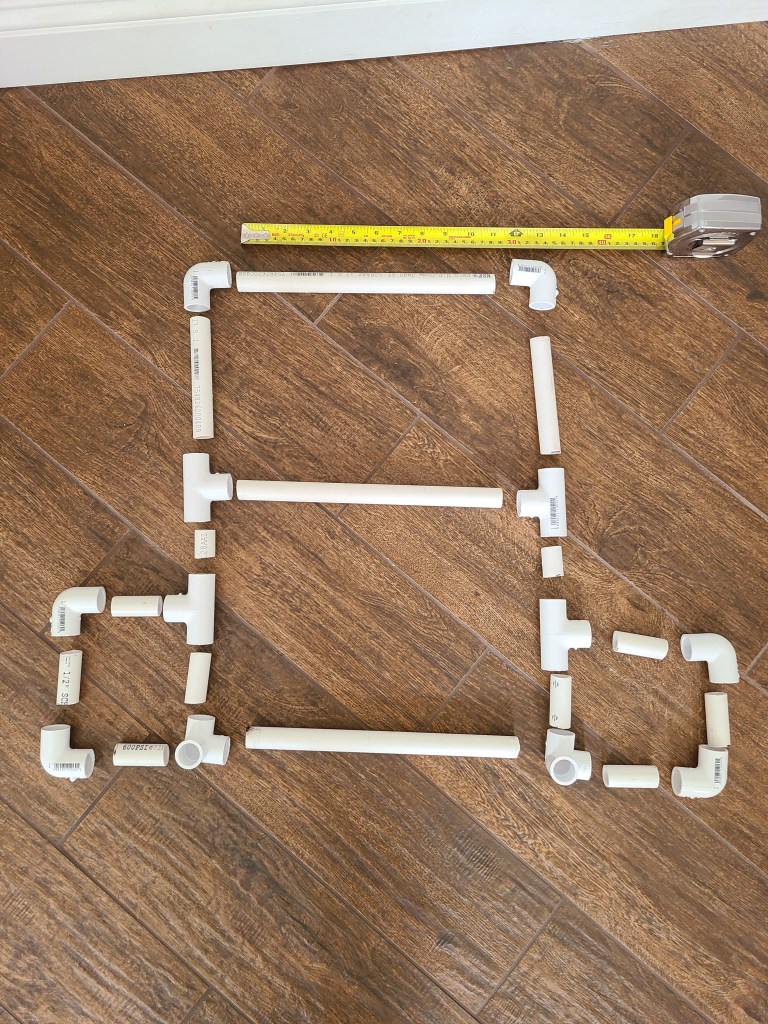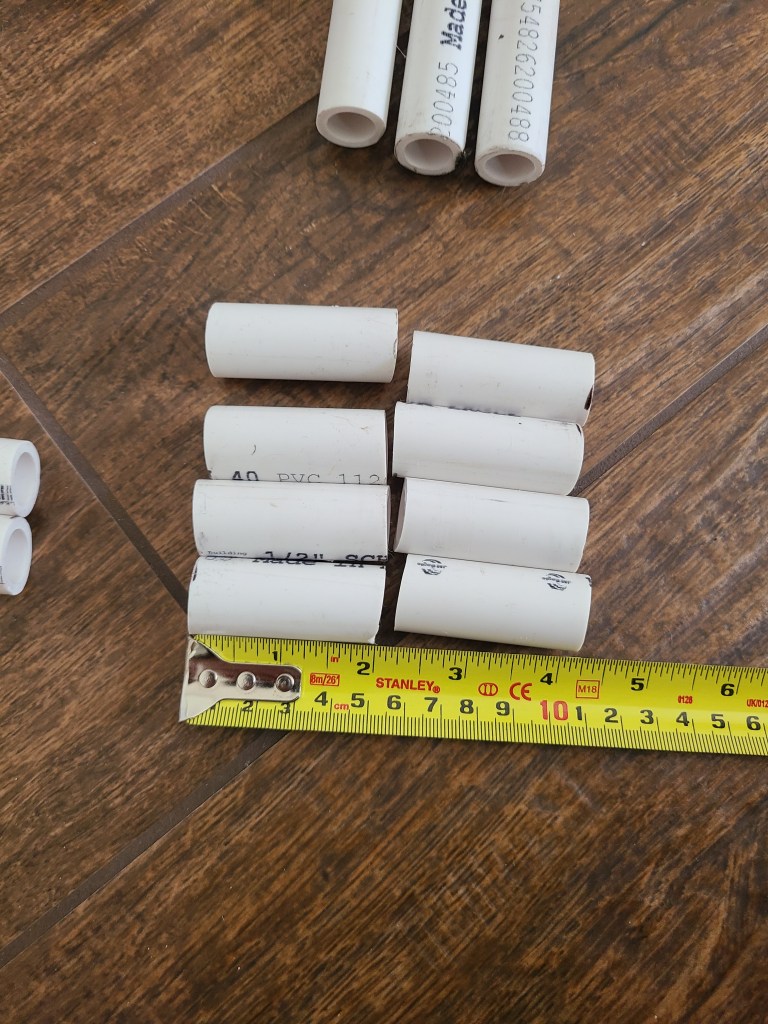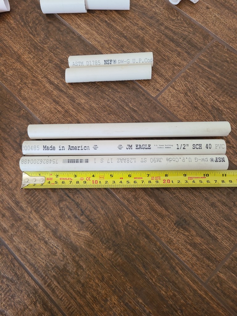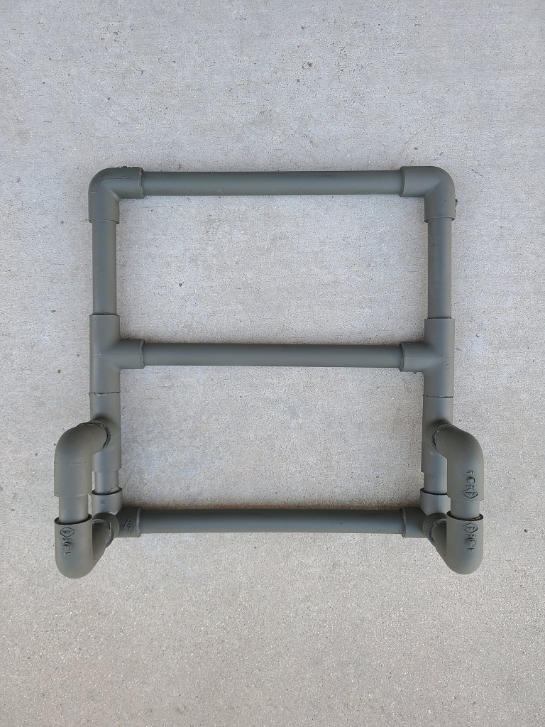 Fittings used are; 2 riser 90s, 4 tees, and 6 90s. The pipe pieces are 2 roughly 5″ pieces, 2 roughly 1″ pieces, 3 11″ sections and 8 2″ pieces.