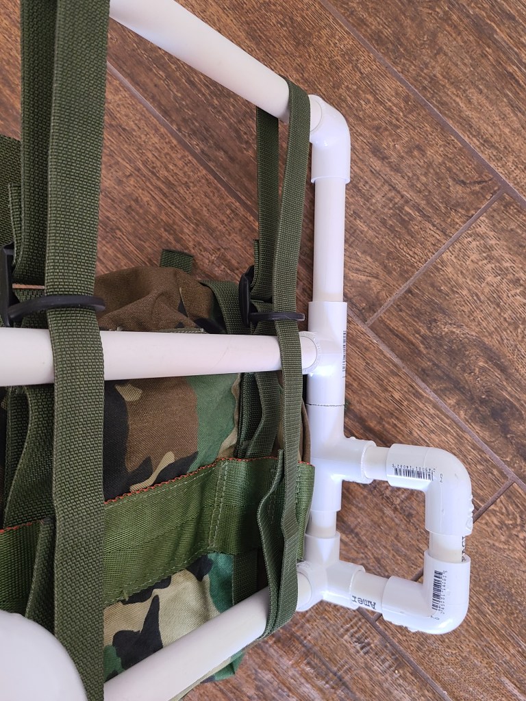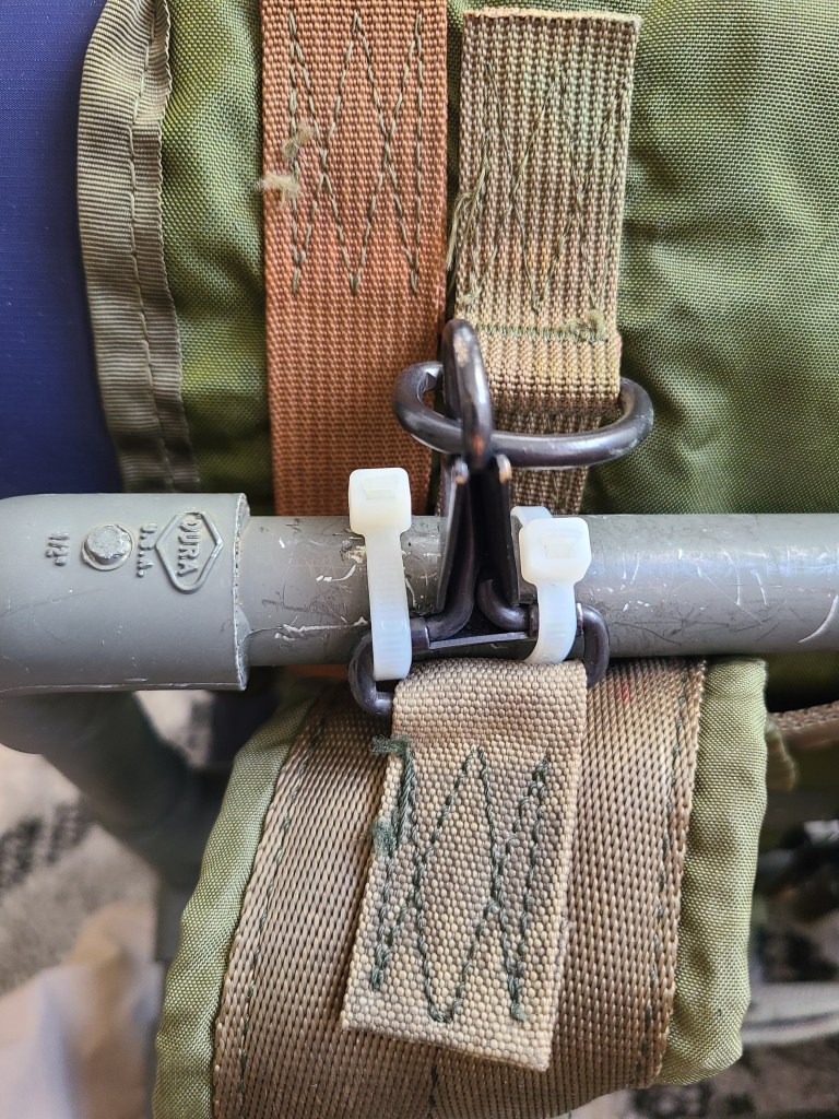 An optional addition that isn’t required but does make it more comfortable is to secure the hooks to the top bar. Zip ties work great but you can use whatever you prefer. This pulls the frame forward towards the back and makes it more rigid.