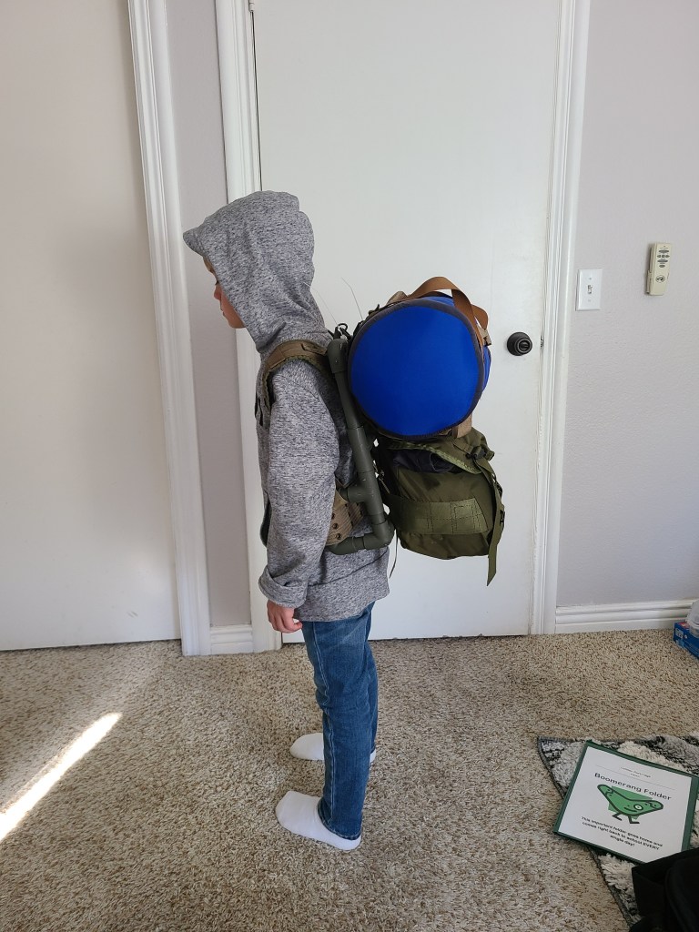 I debated over the height and position of the bar but basically centered seemed the easiest to build and most useful. The shape of the frame is something of a hybrid of the lightweight and ALICE frame. I didn’t shape/bend the pipe like the lightweight as it would have required an excessive bend due to the smaller size. That also would not allow enough offset for the kidney/hip pad as well as pull the shoulder straps out too wide to stay on the clone’s shoulders.