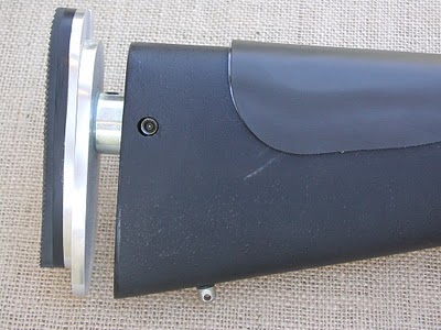 The next area that needed attention was the buttplate adjustment rod. The buttplate extends and is held in place by a set-screw through the side of the stock which bears against the main rod; I had the extension set at 3/4″ over fully compressed. Under the recoil of the .30-06, the buttplate would sometimes slowly push back in, overcoming the resistance of the set-screw. I first filed a flat onto the rod, thinking that would give the set-screw a bit more area to bite, but that didn’t help much. Next I decided that a fixed spacer would do the trick. A quick trip to the local hardware store turned up a couple of good candidates: a 3/4″ ID x 1″ long steel spacer and a 3/4″ ID x 9/16″ long shaft collar with a set screw to hold it in place. In the second match (598-39X), I used the 1″ long spacer; it cured the compression problem, but I found that it extended the buttplate a bit more than I prefer for ease of loading. At the next match I’ll try the 9/16″ long collar. If that’s too short, I’ll see if I can get a friend to cut the 1″ spacer down to 3/4″ on a lathe.