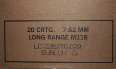 It is now loaded as the 7.62MM LONG RANGE M118 (LC LR 96 to LC LR 09). Neither the boxes nor the cases bear any reference to match use; only the un-cannelured hollow point bullet suggests a National Match connection. ATK Lake City (Alliant Techsystems) advertising calls it the M118, 7.62mm, Special Ball: Long Range, which only adds to the confusion. It can be argued that it is related to the M118 and M118SB but it is, in fact, a completely new cartridge, a combination combat/sniper/match loading with un-crimped bullets and primers, loaded with Alliant Reloder 15 powder.