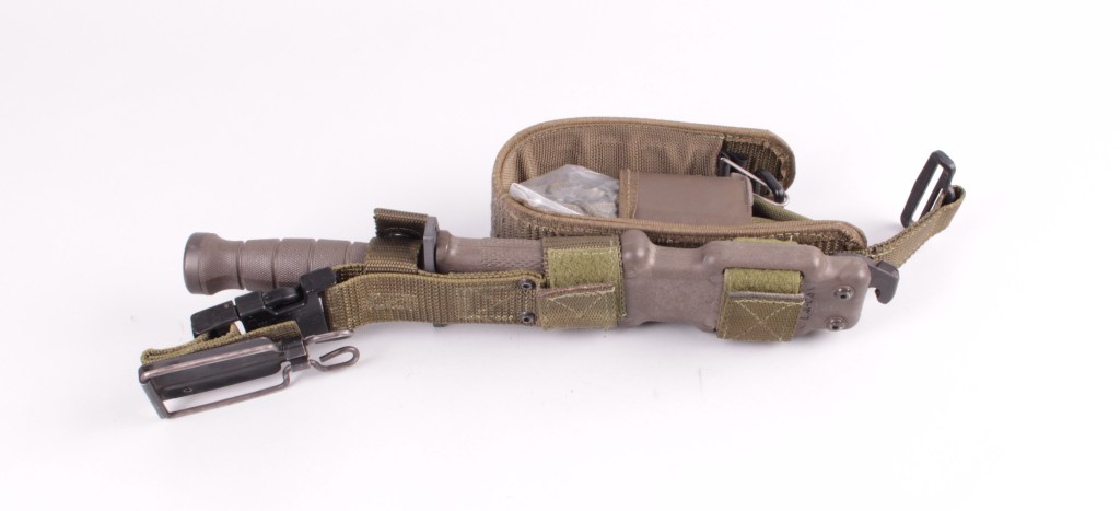 In addition to the physical differences of the knife itself, the scabbard has features that make it very different from the normal M9 bayonet scabbard. The most significant difference is the presence of what is labeled as the ‘M11 EOD Tool Pac’.