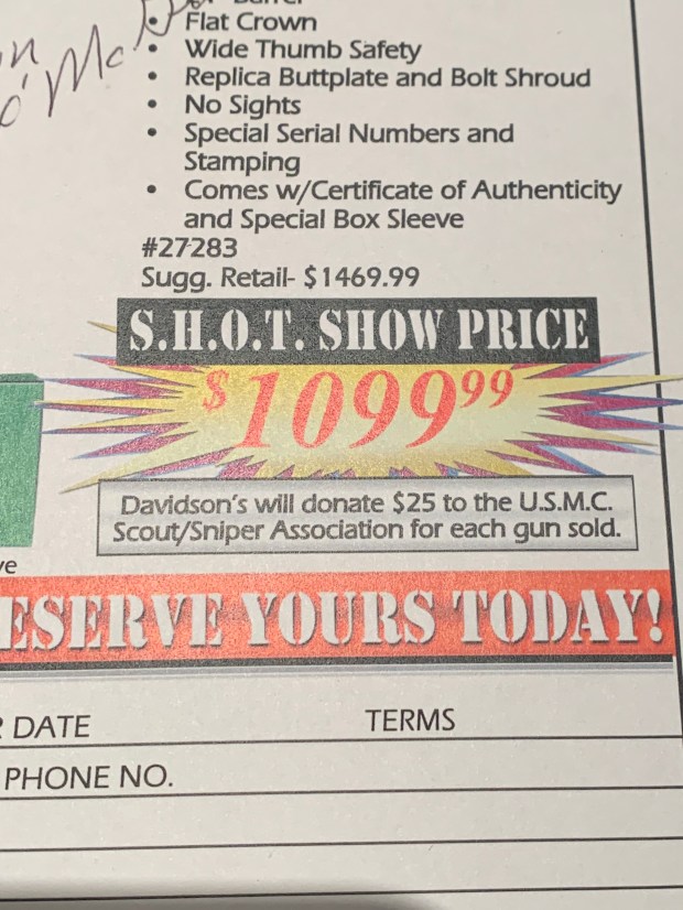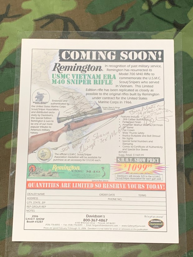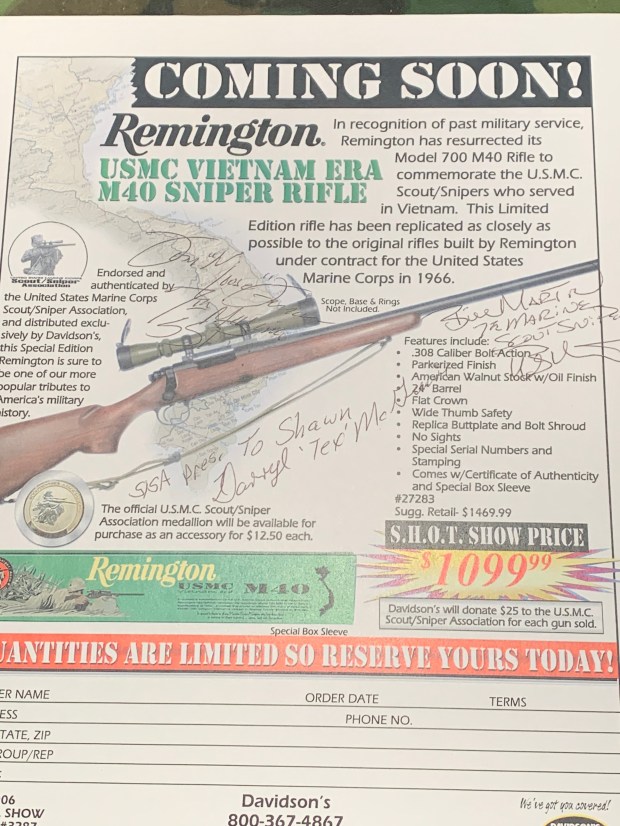 SHOT show flyer signed by three famous Vietnam war snipers who were at the Remington booth promoting the rifle.