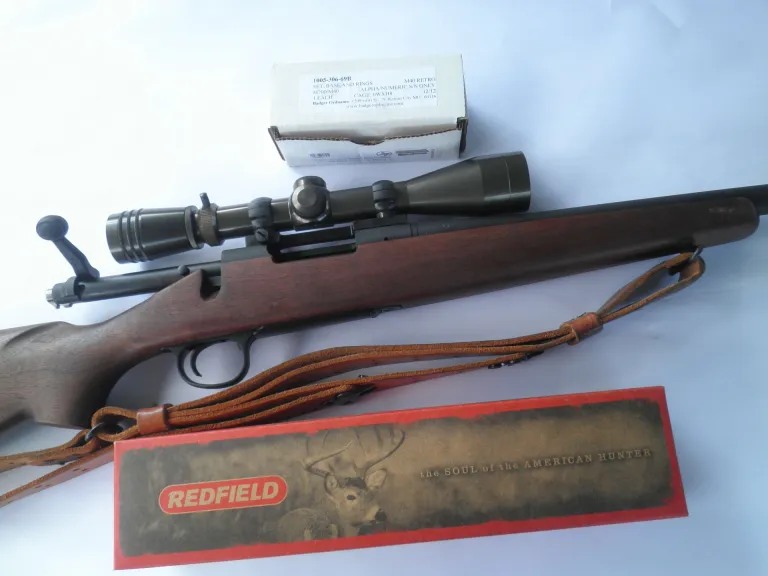The “Redfield” is just a green Leupold VarX-II that says Redfield on it. Hey thats close enough! But stupidly they put a Mil-dot crosshair inside… Stupid.