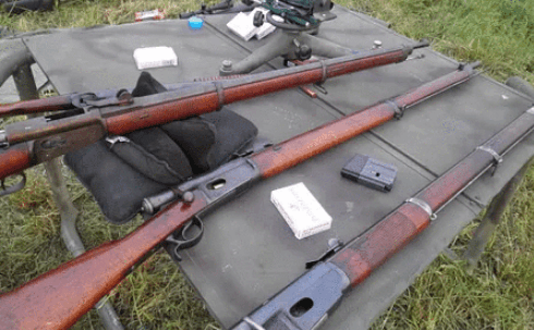 Some old Swiss rifles. This was taken during the project to convert them to center fire .41 Swiss and make hits at 300 yards.