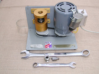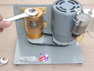 The top picture is from Doug’s website and shows the current version of the trimmer. Mine is old and doesn’t have a belt guard, but I think that’s the only difference. Here you see the unit along with the case holder and the cutter head.
