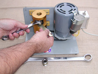 Screw the cutter head in by hand, then tighten it down with a 5/8″ wrench while using the supplied spanner to hold the base.