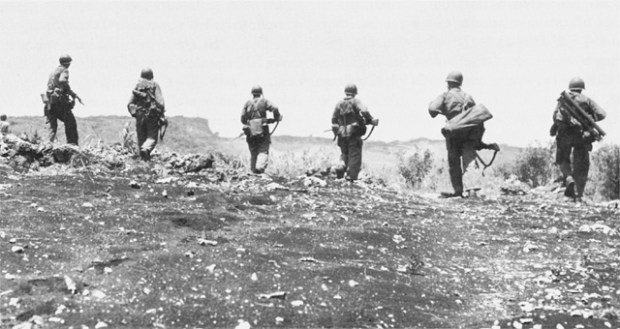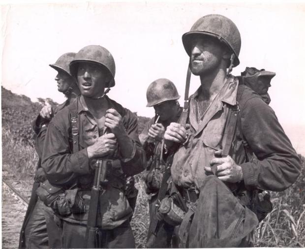 Weapon wise the vast majority of soldiers were armed with the M1 Garand. Few M1 Carbines or M1918A2 BARs are even seen. So it can be assumed that the Division was following the basic TO&E pretty closely (1 BAR per squad and carbines for officers/specialists). I didn’t come across any submachine guns or M1903s in the pictures I found.