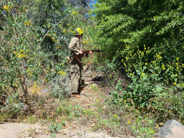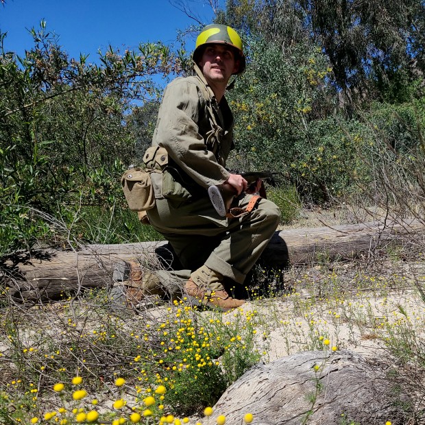 Another little quick detail that seems to have been a popular trend on Saipan as well was wearing the shovel/e-tool on the suspenders. Also the older T-handled shovel was in use and not the newer folding. A small detail is that a lot of the soldiers kept their chinstrap buckled as well.