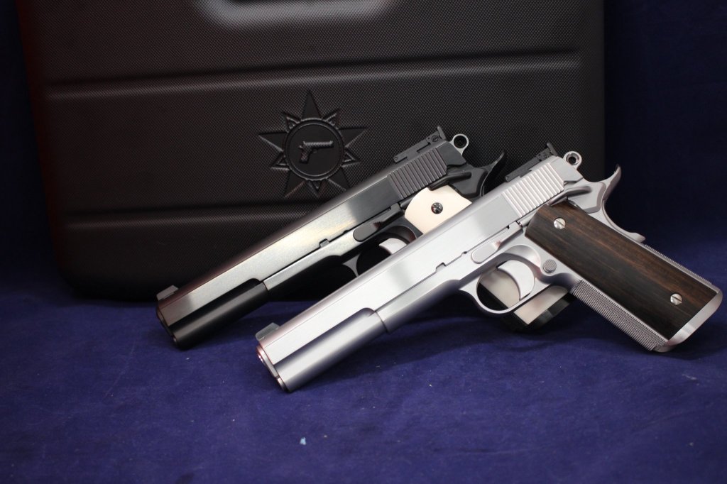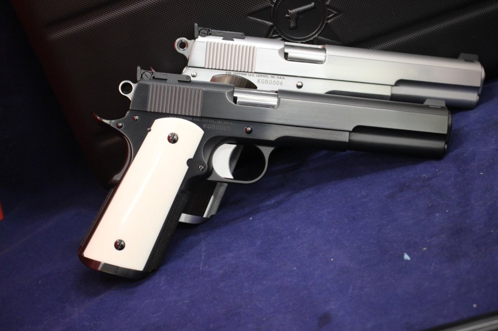 The guns, sequentially #’d KGB frames, 9mm Longslides with 38 Super barrels fit. One in Stainless, one blued. Wearing Authentic Imitation Ivory and Macassar Ebony from Sean’s Ugly Grips-Karl