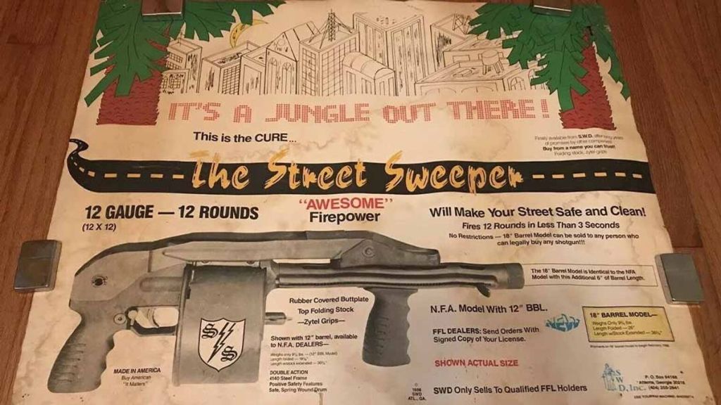 In the United States the gun was produced by Cobray and called the Street Sweeper, made and marketed from 1989 to 1994 with slogans like, “It’s a Jungle Out There! There Is A Disease And We’ve Got The Cure.” And “Make your streets safe and clean with the help of ‘The Street Sweeper’!” Cobray also manufactured the MAC-10 and MAC-11 machine pistols.