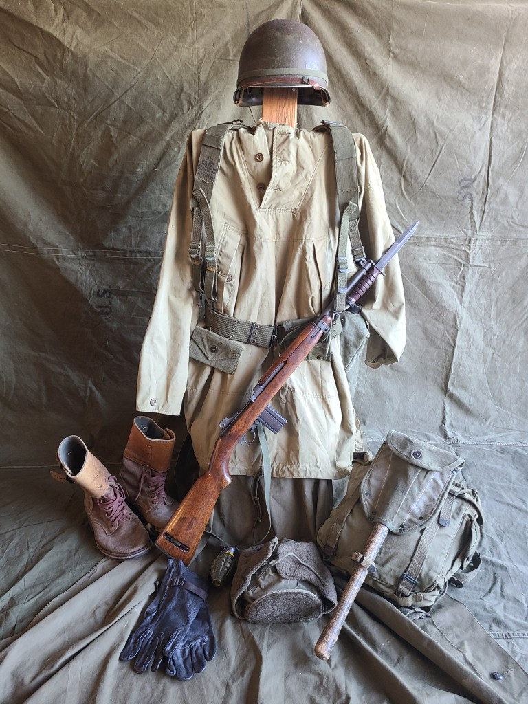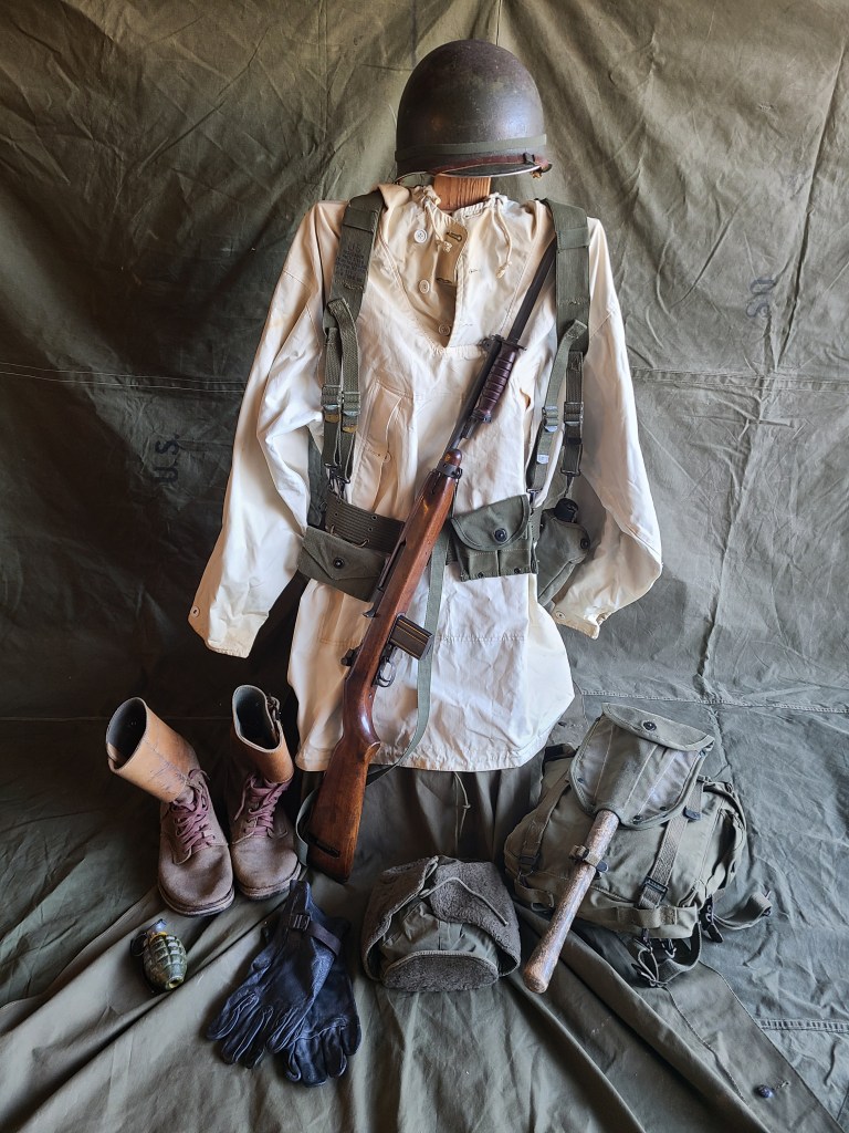 The web gear were the M1944/45 suspenders and M1945 pack. Although the pack is seldom seen outside of marches. The M1 helmets of the Army in Korea are almost universally bare but they do often sport an elastic helmet band. Likely M1944 ones pulled or cut free from the net. The M1 carbines we issued with 15 round magazines typically with the 30 rounders being reserved for the M2 carbines. While not a hard rule that was the general premise. The allowance seems to be for only 3 magazine as well which seems awfully inadequate. But most photos I see of carbine armed soldiers only have the single pouch. (obviously there are plenty of exception but just in general)