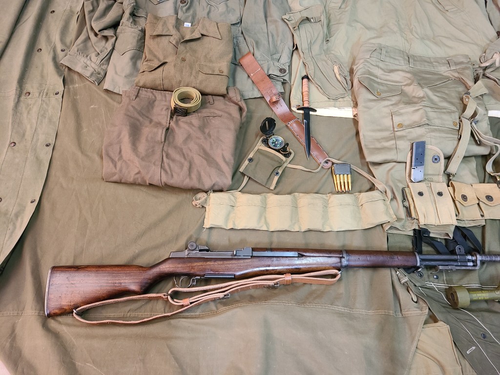 Below is the M1937 wool uniform and belt, with the famous V-42 stiletto or dagger next to it. The extra long sheath was to allow it to hang below the rest of the web gear to remain accessible. Next is a compass and pouch and bandolier. you also get a decent view of the mountain trousers with the buttoned thigh pockets and zippered hip pockets. As well as the elastic at the bottom. The M1 Garand was the standard weapon of the First Special Service Force although they are famous for use of the Johnson LMG for their support weapon. M1A1 carbines were also used, although in small numbers and according to the T0&E only by higher ranks.