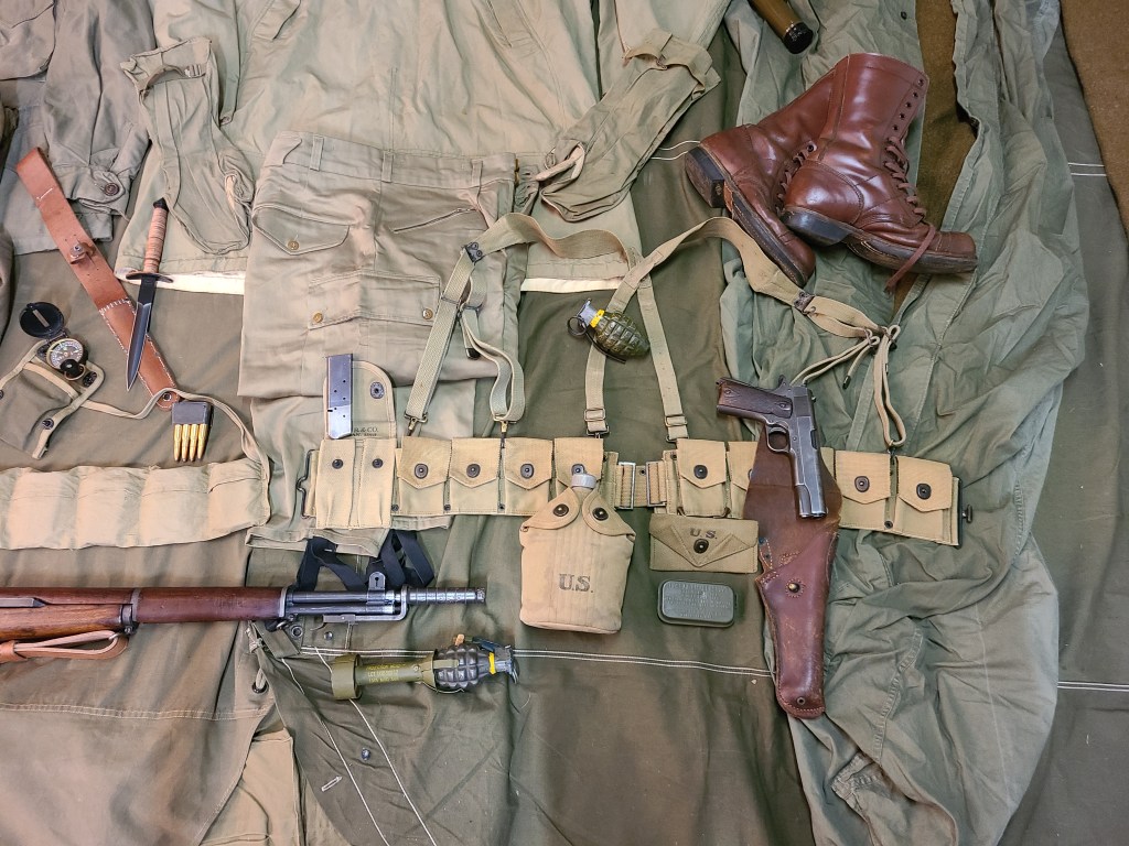 A good shot of the Mounted Cartridge Belt or “9 Pocket Belt.” These would have either been the WWI vintage M1912 or later M1923 variety. The suspenders are the ubiquitous M1936. The Boots are the famous Jump Boots. The weapons are the M1911A1 pistol and the M1 Garand with M8 grenade launcher on it. It seems the forcemen just used the pockets of their pants to carry the rifle grenades instead of GP or Thompson bags.