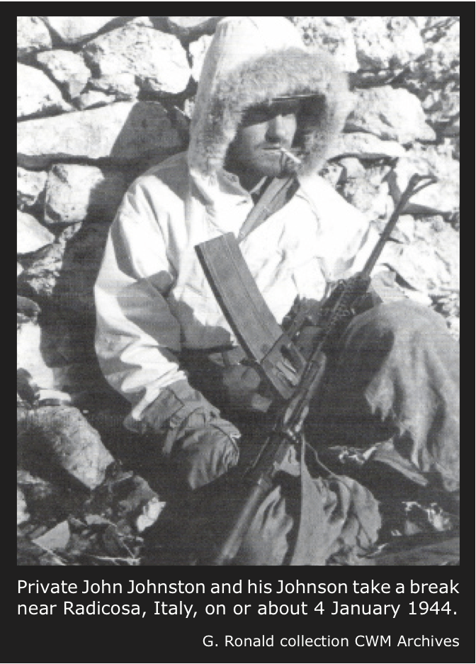 All three men served in the 1st Regiment, SSF. According to Ken Joyce, the photo was taken “in the shadow of Mount Sammucro in the vicinity of Ceppagna.” The white tags are casualty tags; Joyce surmises that these NCOs were wounded during the actions of the 1st Regiment around Mount Vischiataro (Hill 1109) on January 6-7, 1944.  LAC photo