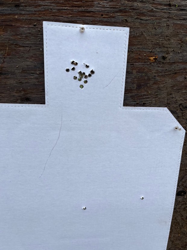 Center body shot is the zeroing shot. Head region is full 20 round group.