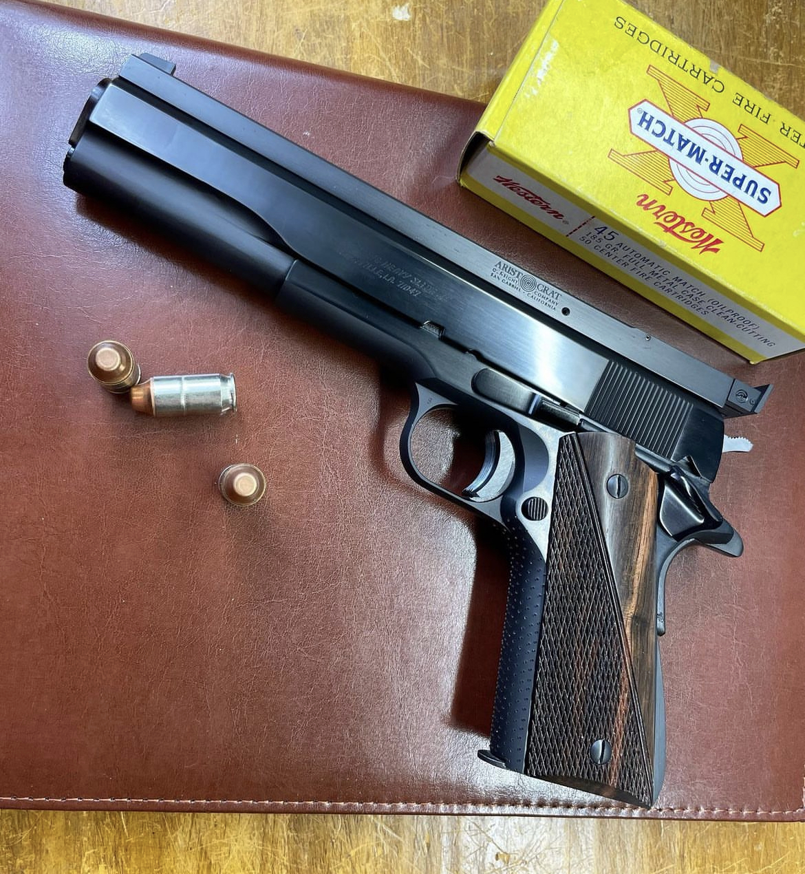 Jim Clark Colt long slide in .45 ACP. Clark was a highly decorated and accomplished Marine sniper. He also competed in NRA Bullseye Pistol competition for twenty-eight years, finally retiring in 1975. Clark won the National Pistol Championship in 1958 and is the only civilian ever to accomplish this feat. He won the National civilian title five times. He was the fifth man in the U.S. to break 2600 and the fourth to break 2650. So suffice it to say the man knew a thing or two about firearm accuracy. Jim started pistolsmithing in 1950 and was highly regarded as one of the true innovators of pistol accurizing. He is responsible for numerous innovations aimed at improving performance of the .45 ACP Colt. He discovered that six inches probably represents the ideal length for the barrel. He began using Douglas barrels that incorporated an integral feed ramp of his own design. This novel concept served two vital purposes: First, it cured a lot of the feeding problems that stem from the juncture between the feed ramp at the upper front of the magazine well and the relieved area at the lower edge-of the chamber. Second, it supported the case head and thus prevented the occasional problem from blown case heads. Clark eventually manufactured such barrels entirely in his own shop. Another Clark innovation was the long-slide conversion, and that came about rather fortuitously. Visiting a war surplus store in Arkansas, Clark came upon an entire oil drum full of GI pistol slides that had been cut in two by the government in the process of deactivating service pistols. Clark bought the entire lot of destroyed slides for a dime apiece and spent the next several years turning them into long slides. With the supply finally exhausted, he had them made from scratch by an outside vendor. Unlike Hoag’s long slides — you can usually see the weld border at the front of the slide. So what is the quintessential Clark? In my opinion it’s a ribbed long slide with tiger tooth front strap. This one shod in hand checkered grips by best in the biz