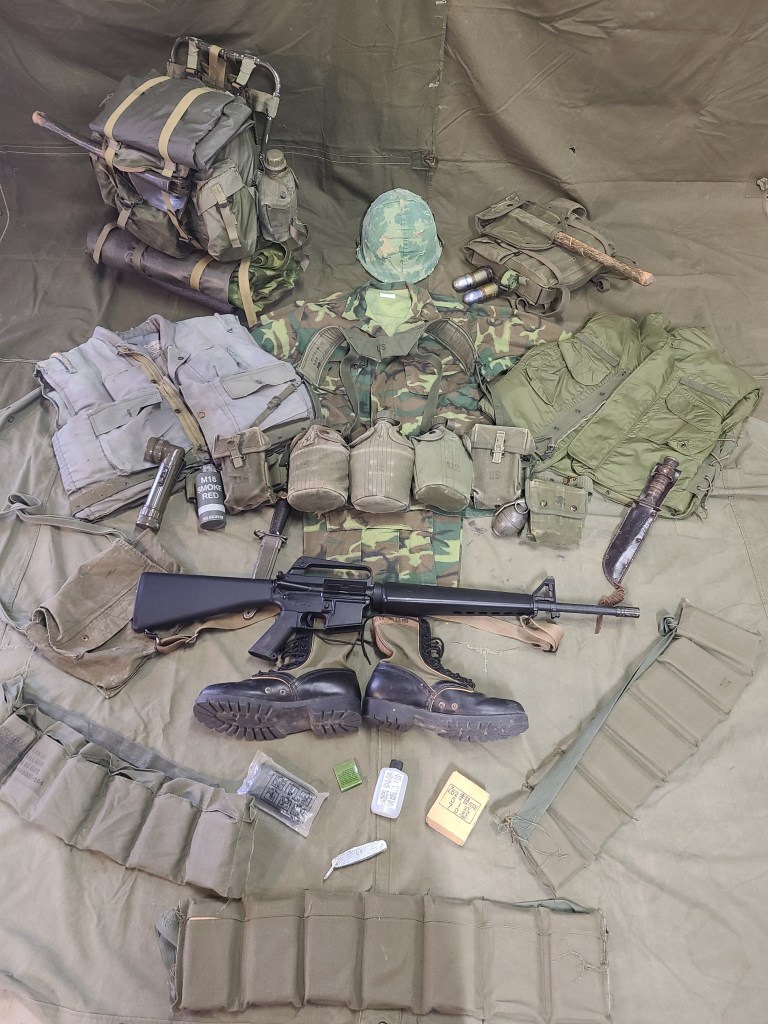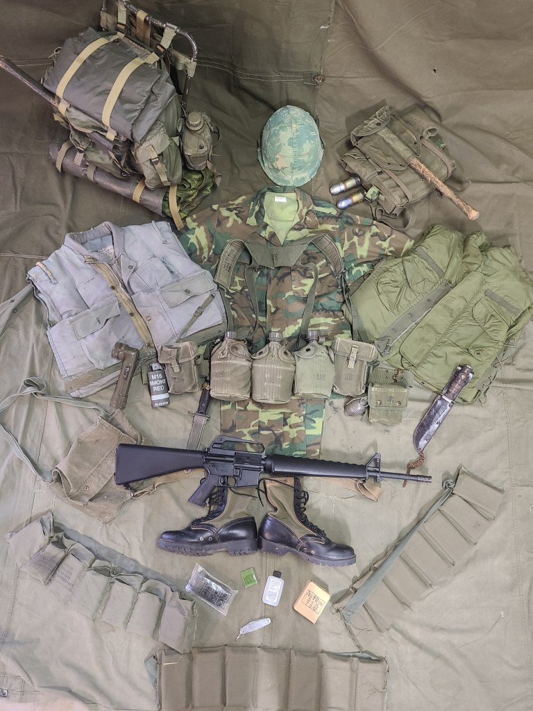 You can see a good mix of gear below. There are the Lightweight rucksacks, regular M1941 Haversacks and a packboard. As well the M1955 and M69 flak vests along with a mix of ERDL and plain jungle uniforms. One Marine appears to be wearing a rain jacket as well.