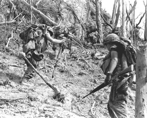 Hard to make out much below but I thought the marines 2nd from the left had an interest helmet set up with a net reminiscent of WWII. A rare sight in Vietnam.