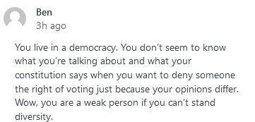 Let’s ignore the fact that I live in a Republic and not a “democracy”. He is referring to my belief that insane abominations shouldn’t be able to vote. I am a little insulted because he didn’t list my other beliefs, like leftists, liberals, commies and the self mutilating mentally ill, shouldn’t be able to vote or own guns or have freedom of speech. I’m not much on supporting any of the rights of people who want me dead these days to be honest. I’d even go further but I’ll let you all figure it out from context.
