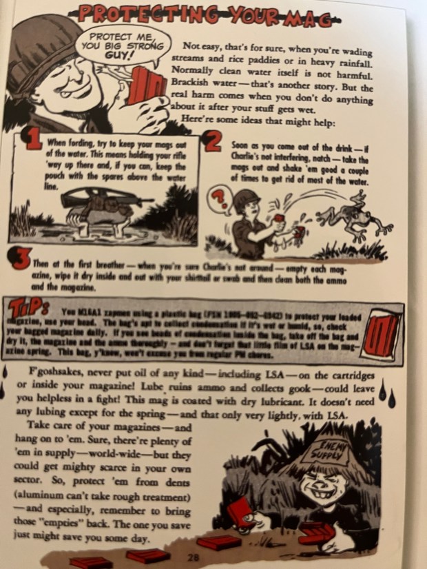 Turns out things get wet really easy in the jungle. They learned this in the Vietnam and so bright spark came up with these plastic bags for your M16 magazines.