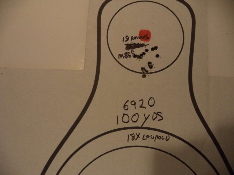 I drew a few dots and set the target out at 100 yards and got to work. Above is a 18 round group fired with M855. It is not a bad groups actually if you look at it in context. Some of the rounds obviously were not consistent with the rest, but the rest did give a group not bad at all for military ammo. I have seen M855 do better, but it is not match ammo.