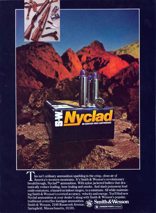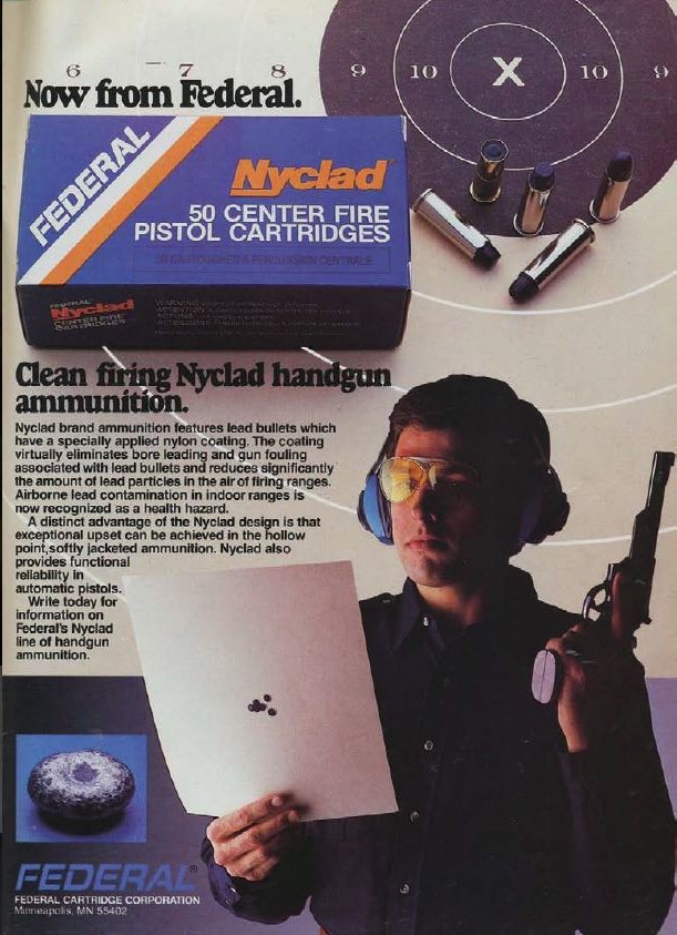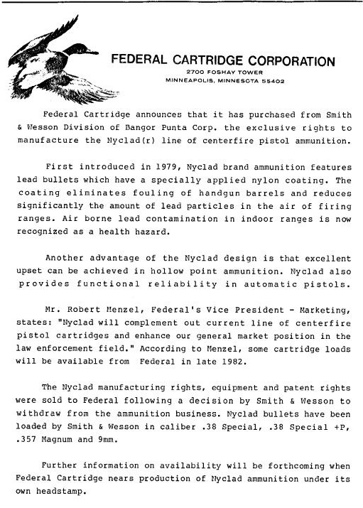 When S&W got out of ammo manufacturing in the 1980s, Federal Cartridge bought the patent rights to the Nyclad. Federal announced their acquisition of the Nyclad patent in March 1982, also noting the benefits of reducing fouling and lead pollution before the benefits of expansion and feeding in semi-auto pistols.