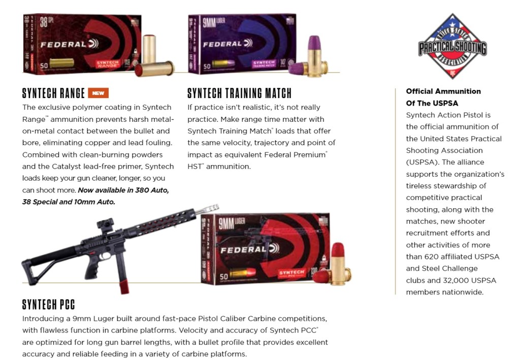Introduced in 2017, Federal’s new Syntech line is sort of Nyclad 2.0, but they have replaced the nylon with a different polymer. Federal has made the interesting decision to color-code the loads by application: red is standard range and target ammo; purple is training ammunition that matches HST duty loads; and blue is self-defense and hunting ammunition. The latter includes the Syntech Defense – a fragmenting hollowpoint.