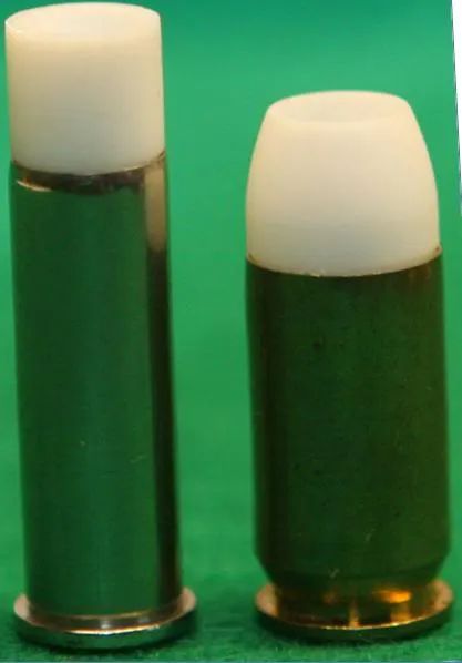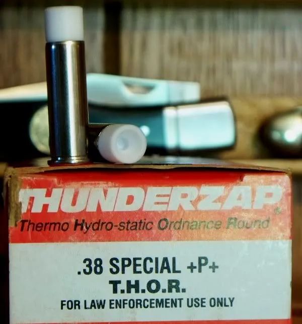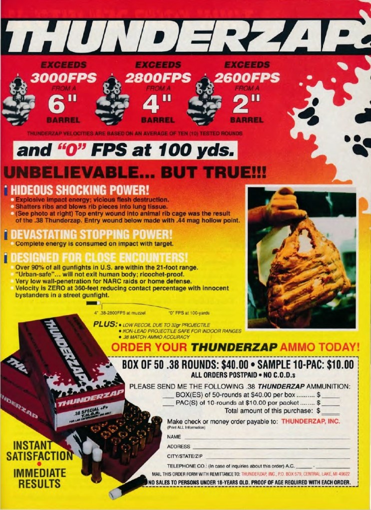 Since we are on a Second Chance Body Armor kick, I thought I’d circle back to a gimmick round sponsored by Richard Davis – the Thunderzap. Available in .38 Special and .45 Auto, the Thunderzap was a lightweight, hyper-velocity hollowpoint made from 100% fluorocarbon resin.