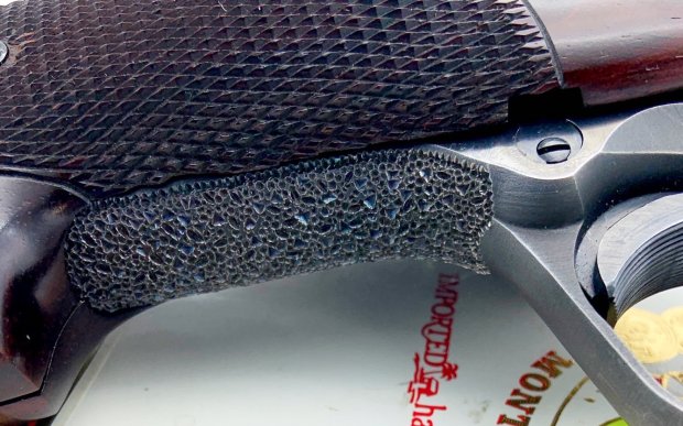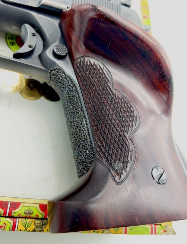 The base pistol is a 1948-vintage Colt Government Model. It wears a Micro adjustable rear sight and Lew Sanderson target stocks.