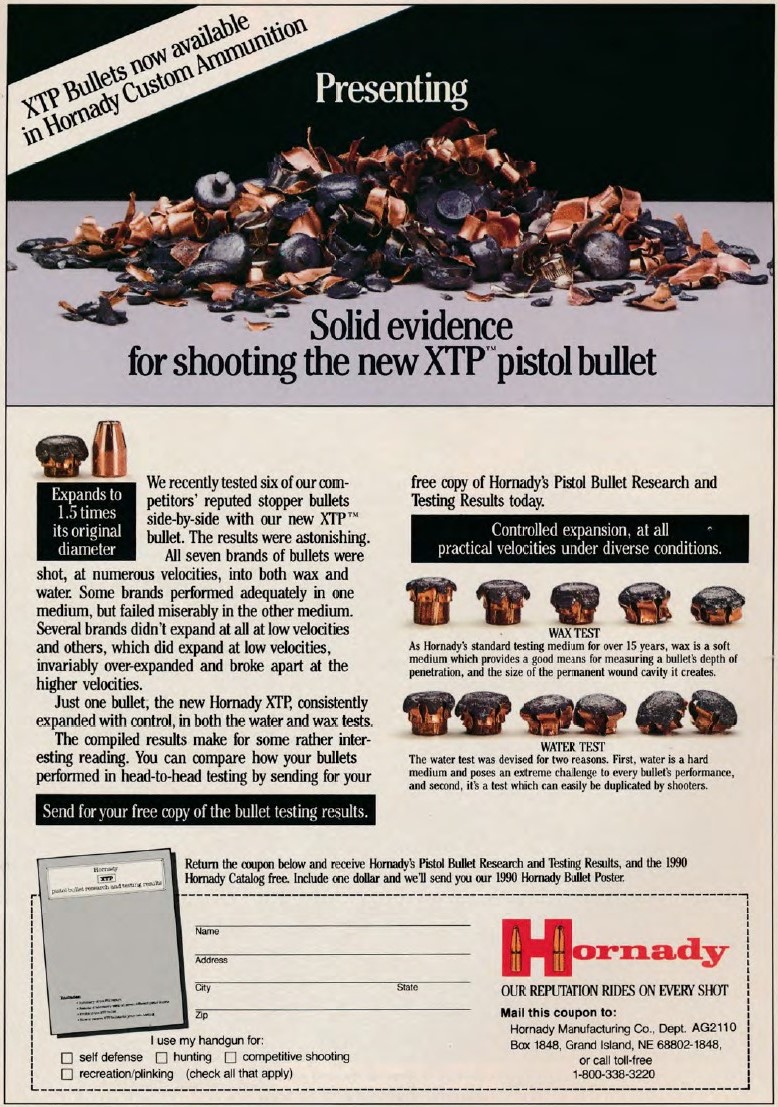 Hornady first started to advertise their eXtreme Terminal Performance (XTP) projectile in 1990. It appears to have been an evolution of their 1988-vintage Rapid eXpansion Tip (RXT) line. Their goal was 1.5x diameter expansion at a wide range of velocities. If you look closely at their advertisement, you’ll note that they did not use theContinue reading “Hornady XTP Family Data Dump”