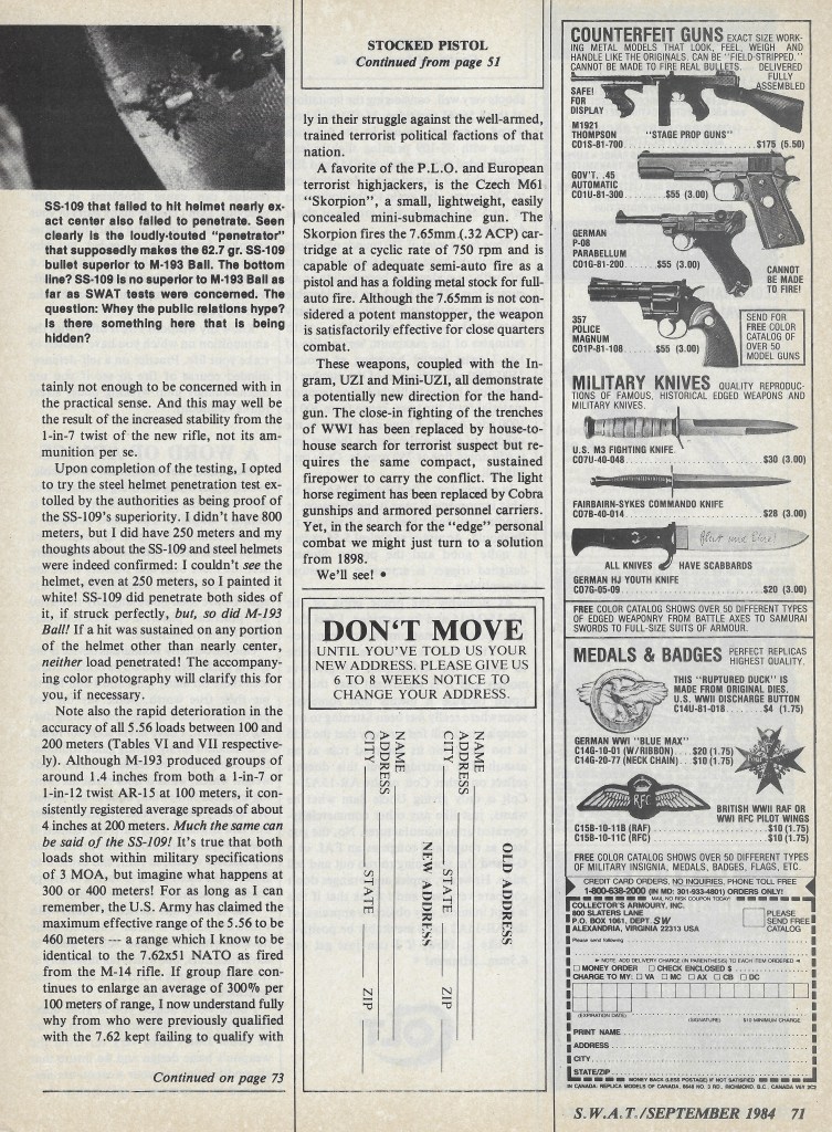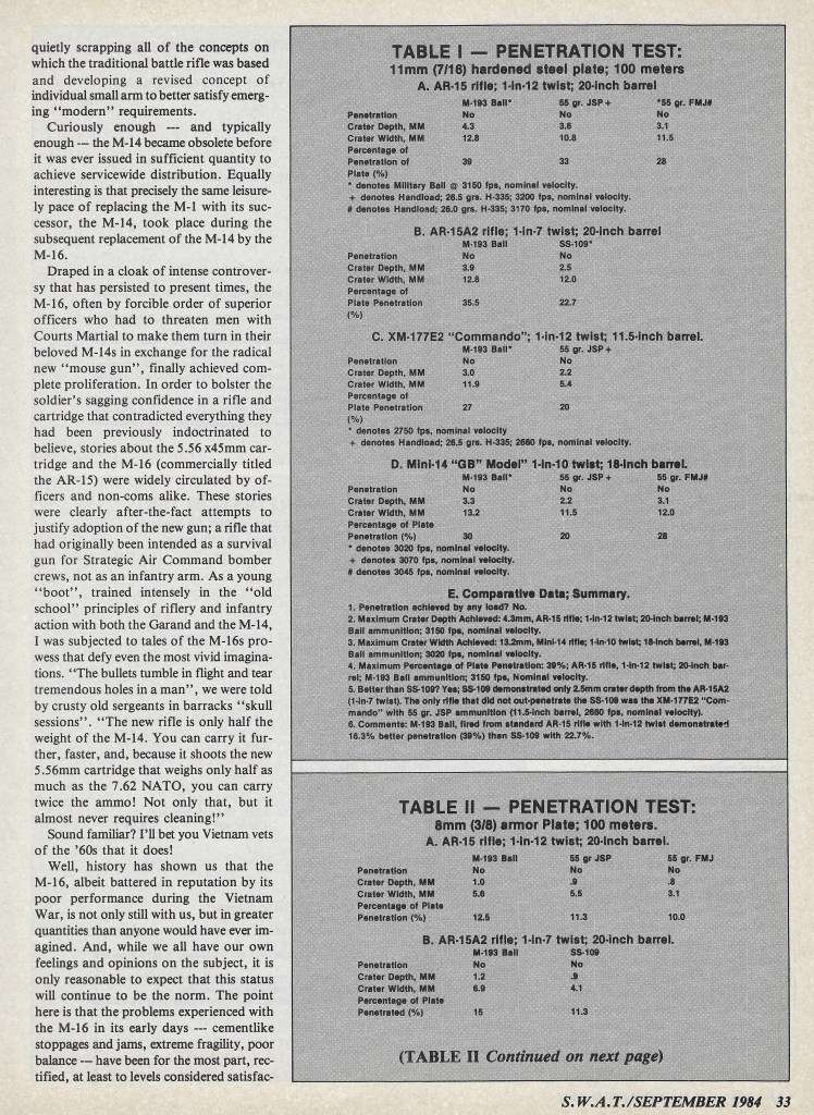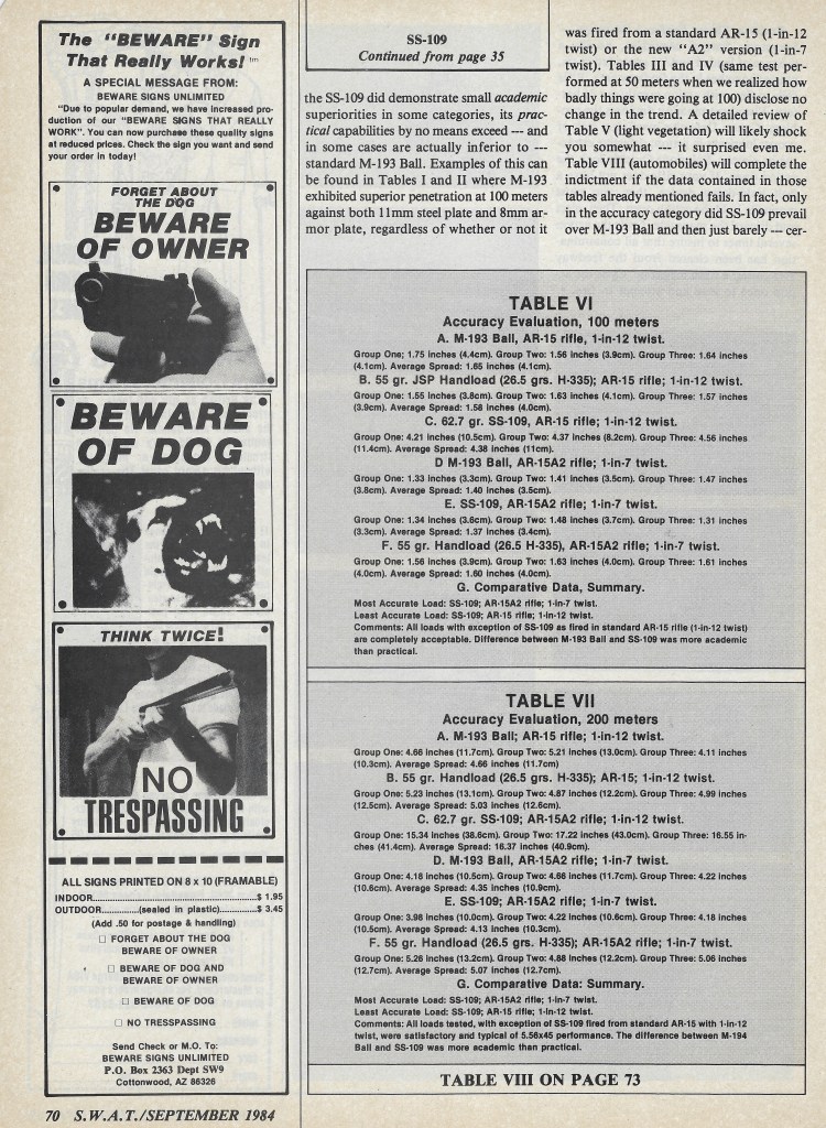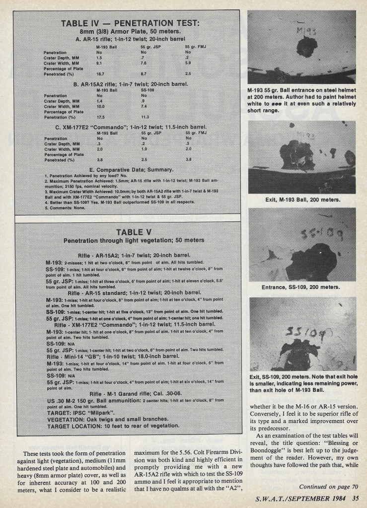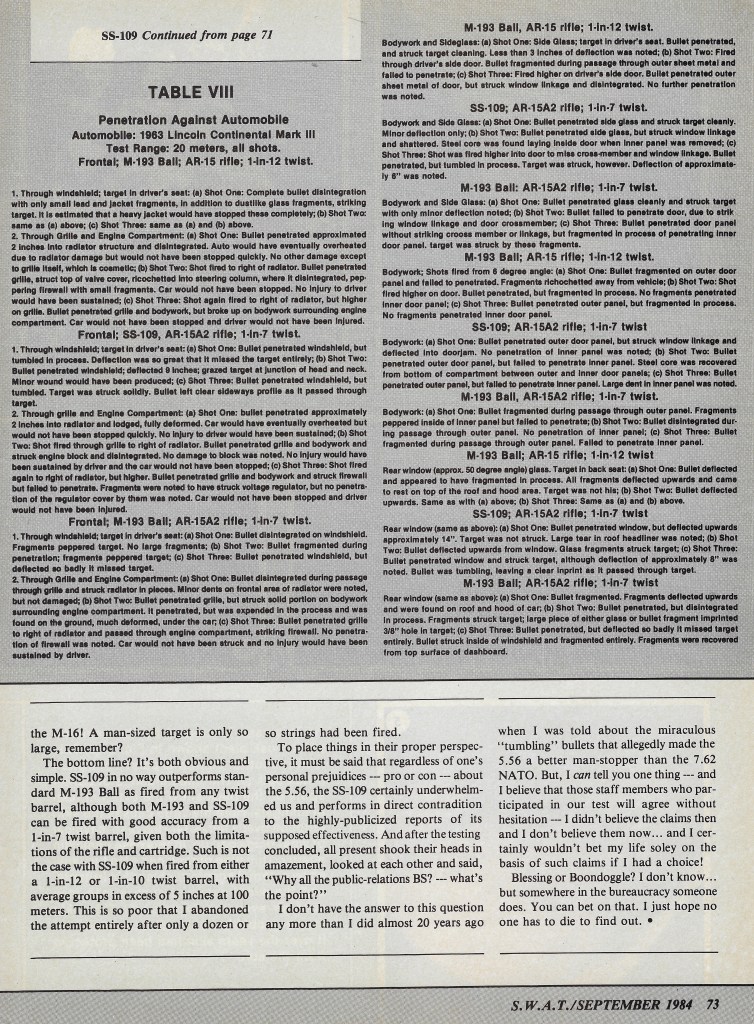 The article below was published in the September 1984 of SWAT magazine and it discusses the DoD test data for the SS109 cartridge that was in the process of being adopted at that time.