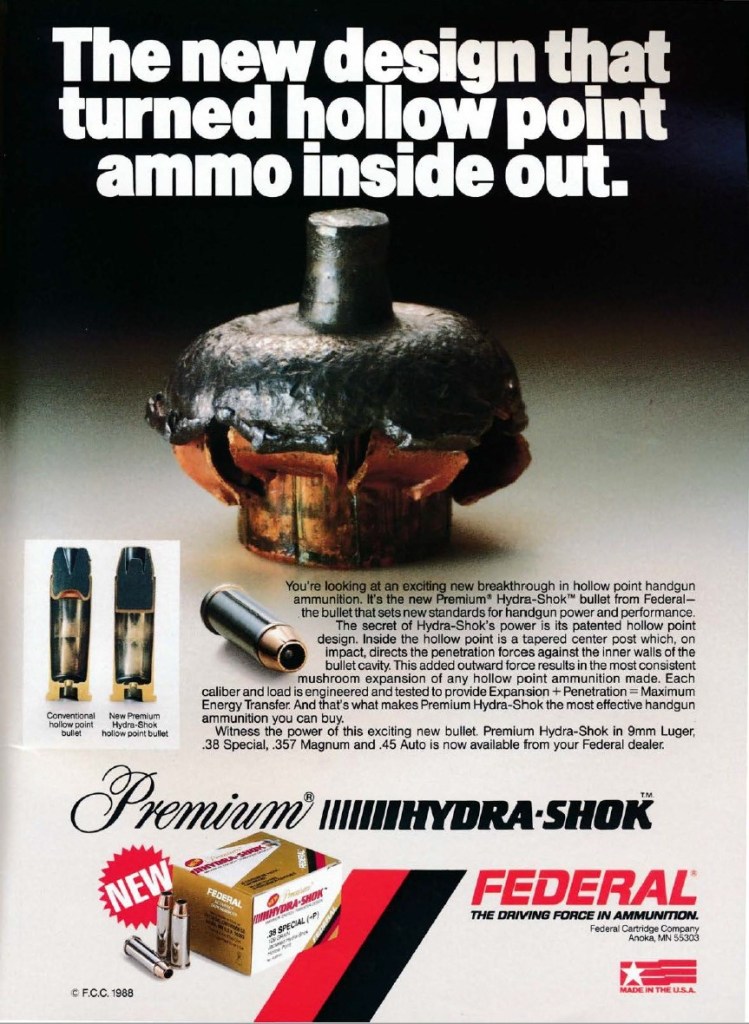 I’ve seen some bad history lately regarding the Hydra-Shok. Federal Cartridge’s PR department keeps stating its introduction date as one year later, and some folks don’t realize that the Hydra-Shok was marketed for roughly a decade before Federal licensed the patent.