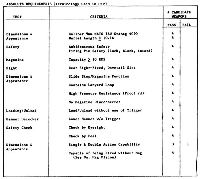 In August 1977, the Air Force Armament Laboratory contacted manufacturers inviting submission of 9x19mm semiautomatic pistols. The basic goal was to keep the selection process simple. The military wanted to select a commercial, off-the-shelf “non-developmental item” (NDI) that would replace all existing handguns in the Department of Defense (DOD) inventory, and thus avoid conducting a research and development program.