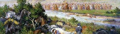 Intent on retrieving the their dead and wounded comrades if at all possible, another of White Thunder’s uncles, Two Crows,with a band of friends went down to the river to retrieve the bodies of Weasel Bear and White Thunder. Stillwell and his concealed party of scouts were still watching the grass for approaching enemy, seeing the grass move about unnaturally, they fired and wounded Bear Feathers with a crease along his right shoulder. Another round fired from the group deflected off Two Crows’ shield that he had tied to his back and another round wounded Black Moon and another wounded Turkey Without Feathers in the shoulder. They managed to drag out their dead friend’s body with a rope they tied to him while another of the party was wounded.-AR