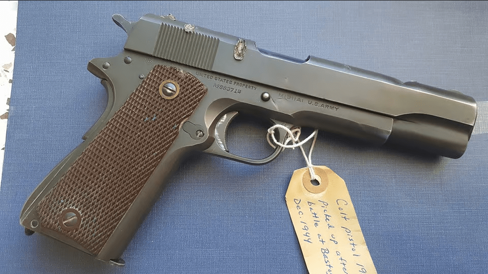 1911A1 hit by shrapnel during the battle of the bulge 1944. The soldier wearing it didn’t make it.