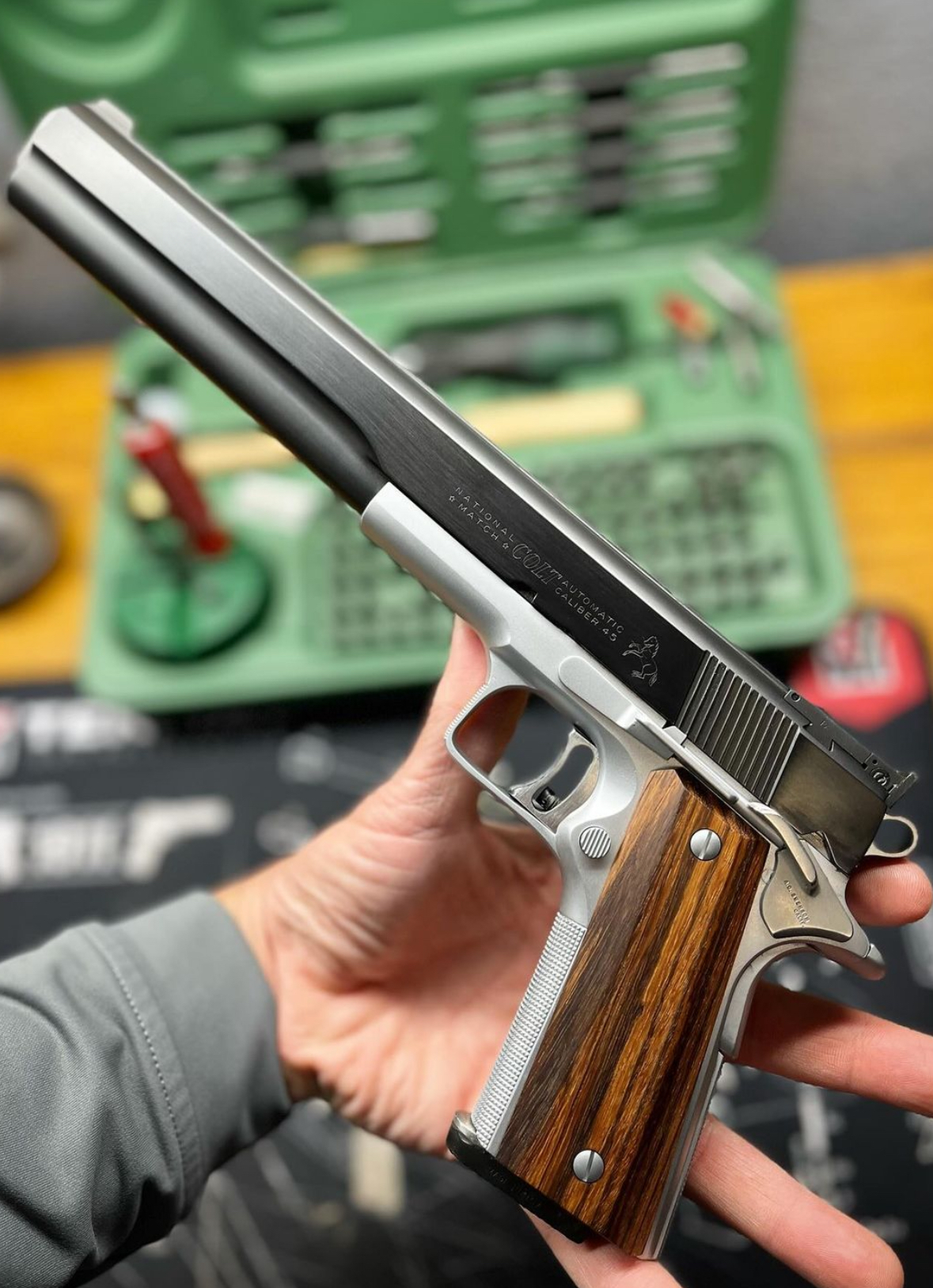 What you see before you is the rarest gun in my collection—a Jim Hoag master grade 8” long slide. Jim built four versions of the 1911. The entry level was the police special, then class B, then class A, and then the master grade. The MG was Hoag’s top model and no expense or time was spared in crafting them. The slide was fit to the frame for a VERY TIGHT surgical fit. Hoag guns are so tight it feels like you need a team of Clydesdales to pull the slide out of battery. Hold my beer Les. Master grades featured hard fit Kart barrels, Swenson thumb safeties, 50 line per inch checkering of the rear of the slide, and the option of a squared and checkered trigger guard. Additional time and energy was spent on MG to make them stand out from their more pedestrian counterparts. Hoag used files and increasingly grades of sandpaper to make crooked Colt lines dead horizontal and smooth. MG pistols could also be modified into “long-slide” versions. Long dongs had the slide shortened to the standard barrel bushing retaining lug slot. After that, a section of 4140 steel was precision bored and reamed to match exactly, then welded onto the slide. A shaper was used to cut the basic contour of the slide and then both horizontal and vertical mills were used to bring the steel surfaces down to a few thousands proud of the original slide. Then draw filing was performed using fine files, reducing the long-slide portion to the original slide dimensions. The Master Grade was subject to meticulous hand polishing of the flats of both slide and frame—an arduous process that took the better part of two days. The top of the National Match slides were welded so Jim could properly fit a Bomar and the front straps were also welded up to remove hideous serrations to make way for Hoag’s flawless hand checkering. That’s a lot of heat on a gun, but the dude was a gunsmith…not a parts assembler. So who’s the greatest 1911 smith of all time? I think it’s Jim. This gun is now completed with a set of Jean St. Henri grips. Jean (out of Malibu CA) was Jim’s dear friend, so this gun has now shod in its forever grips.