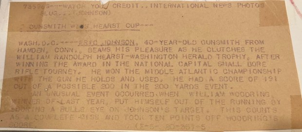 Eric Johnson was the 1926 National Gallery Champion and the 1929 National Small Bore Champion. Eric Johnson grew up in Orebro, Sweden a short distance from Stockholm. At the urging of a close friend he moved to America in 1904 and joined that friend at Fyrberg & Son at Worcester, Massachusetts. When Sears acquired the company?s assets and moved the operation to Meriden, Johnson also relocated. By 1907 Eric was the assistant foreman in the Meriden Fire Arms Company barrel shop and by 1908 he was the foreman. At this time Johnson was also a known marksman competing with the Second Infantry rifle team.
