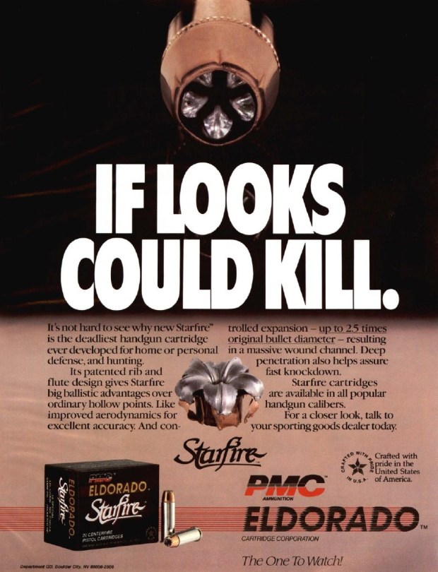 According to Burczynski, he offered the Starfire to Federal Cartridge back when they showed interest in the Hydra-Shok. Federal’s decision to go with the latter was driven by the Federal Bureau of Investigation’s interest in the Hydra-Shok. Winchester already had its Silvertip, and Remington was perceived to be unfriendly to outside inventors in those days. Burczynski tried to reach out to CCI/Speer, but couldn’t make contact with anyone official. This left the choice between Hornady and PMC to be decided on a coin-toss. The South Korean-owned PMC had just opened its US manufacturing facility in Nevada – Eldorado Cartridge Corporation. After lengthy negotiations, PMC commercially introduced the Starfire in late 1991.